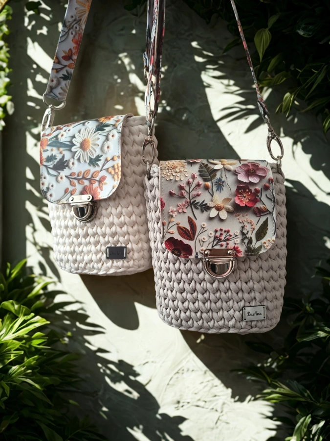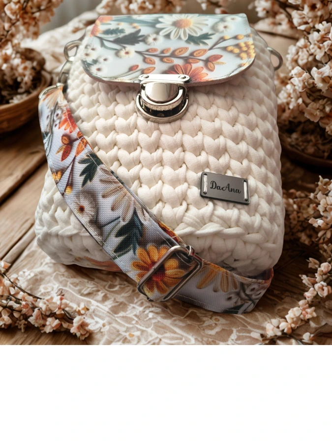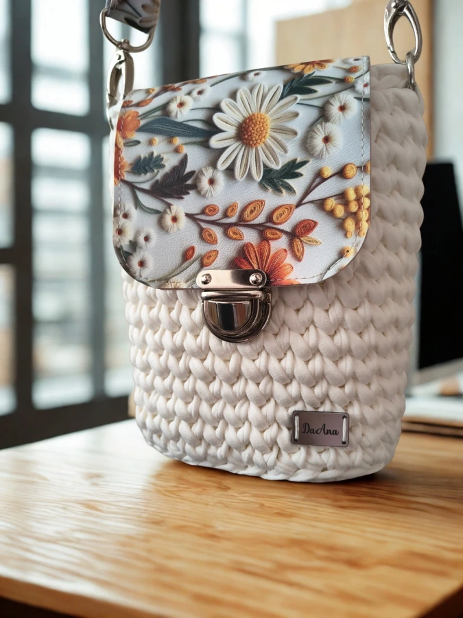 Ručne háčkovaná kabelka, ktorá spája jemnosť kvetov s výraznou textúrou.